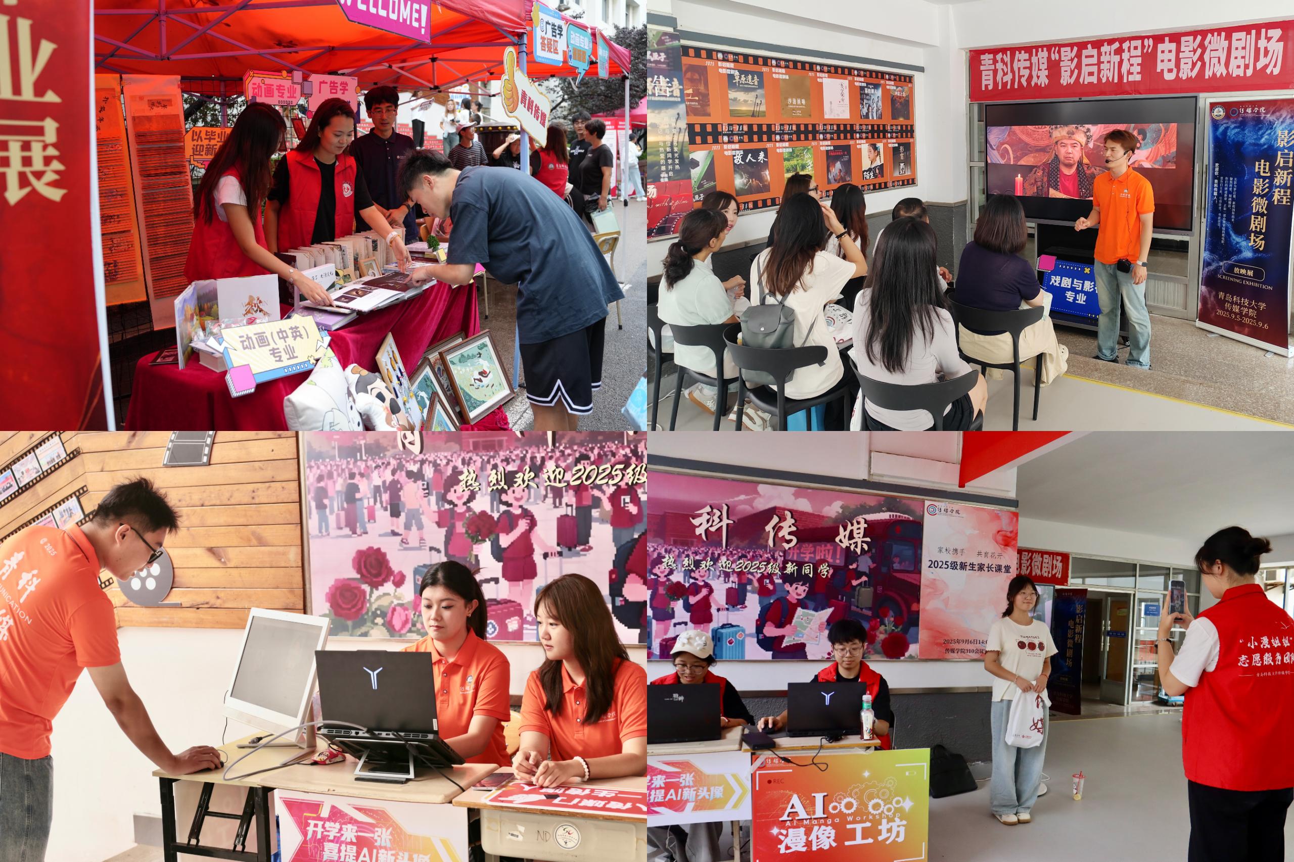 学科导航:以学科引领彰显专业特色。一是推出“以毕业展迎新生代”,集中展示动画、编辑等专业毕业生优秀作品,传承引领新生感知专业魅力。二是开设“AI漫像工坊”,新生现场拍照并生成专属AI头像,体验专业赋能艺术魅力。三是打造“影启新程电影微剧场”,展播学生创作的系列微电影,通过影像叙事展现学术实践与创作实力。迎新一线,学院党政领导及教授、导师齐聚现场,详解专业特色与生涯发展,为新生厘清方向,树立信心。