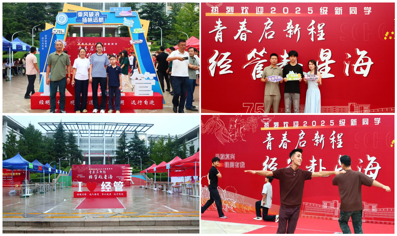 精心布置,凝练特色,点亮迎新温暖瞬间。学院将雕塑设计成门的形态,寓意着2025级新同学从此踏入青岛科大经管学院的大家庭,这是他们人生新阶段的起点;“我爱经管”四个字,是最直接的情感号召,旨在激发新生的归属感与认同感,引导新生带着最初的热爱与认同,开启学习和生活新征程;连接入口与学院的“红色地毯”,是一条“传承之路”,当新生穿过“思想之门”,脚下延伸的是一条鲜艳的红地毯,宛如一条流动的赤色纽带,象征着学院对学子们最热烈、最隆重的欢迎,也寓意着一条传承红色基因、赓续精神血脉的道路;10米长的巨型红色喷绘,是一座“薪火相承经管启程”立志墙,引导着2025级新生立大志、明大德、成大才、担大任。