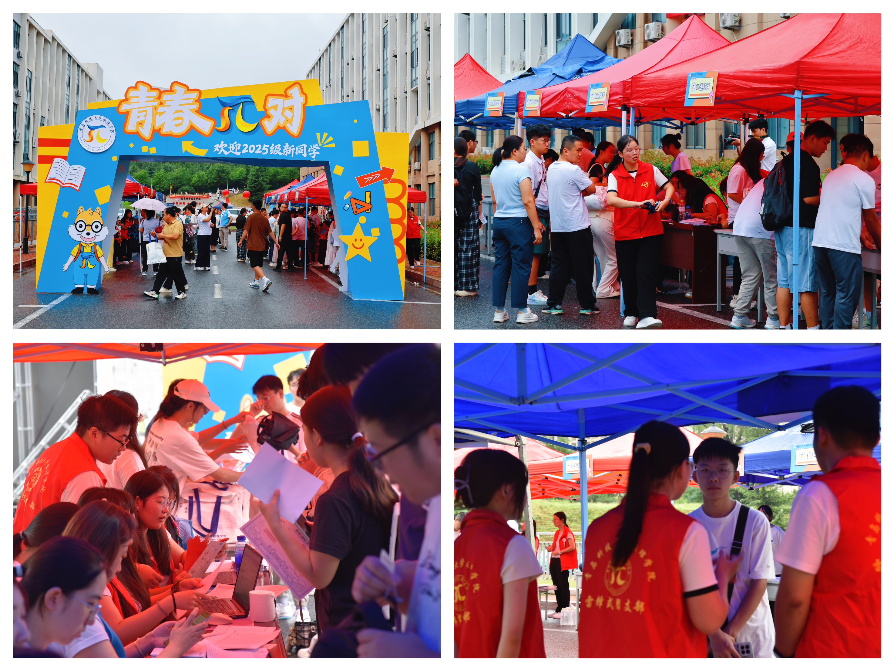 沉浸:“青春π对”驿站营造沉浸式报到体验。报到当天,学院以“π”为灵感,巧妙融合学科符号与青春主题,打造了“青春π对”迎新驿站。现场设置十大功能区,包括报到区、专业咨询台、科创互动体验区、文体娱乐区、主题喷绘打卡点等,流程清晰、服务高效,极大提升了新生的入学体验。学院还为每位新生精心准备了“迎新礼包”,内含学院介绍册、纪念T恤、文创手办等,既实用又具收藏意义,迅速拉近了新生与学院之间的情感距离。整个报到现场既洋溢着青春的活力,又渗透着数理文化的独特韵味,成为校园中一道亮丽的风景线。