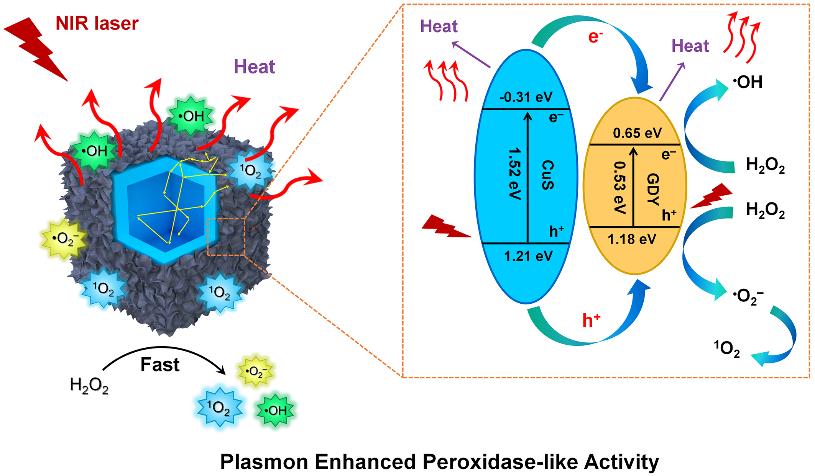 石墨炔是继碳纳米管、石墨烯之后由我国首创并命名的新一代碳材料。由于具有丰富的碳化学键、大的共轭体系、天然的孔洞结构和本征带隙等特征,石墨炔在生长、组装和性能调控等方面表现出巨大优势和先进性,将是推动催化、能源、光电转换及生物医药等领域创新性发展的关键材料。我校材料科学与工程学院隋凝和杜芳林团队聚焦于石墨炔纳米酶性能,在纳米酶抗菌领域开展了大量的工作。近日,团队在外场提高纳米酶催化性能方面取得了新进展。