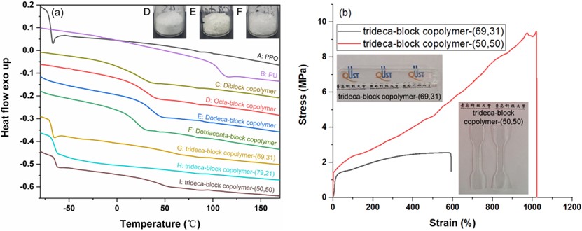 图4(a)PPO均聚物和共聚物的DSC曲线; (b) [PPO18-b-PU27]3-b-PPO727-b-[PU27-b-PPO18]3十三嵌段共聚物的应力-应变曲线