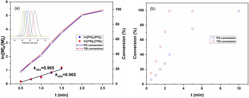 首先,前期研究表明PBB-Br可以高效地催化环氧丙烷(PO)的ROP制备聚醚。进一步地,团队考察了PBB-Br催化PO与对甲苯磺酸异氰酸酯(TSI)交替共聚的可行性。研究结果表明在[PO]0/[TSI]0/[PBB-Br]0= 100/100/1的条件下,两种单体在25℃下5分钟内就可以完全消耗。生成聚合物的GPC曲线呈现窄分布,两个单体的消耗速率相同(图2a),核磁显示聚合物主链是两个单体交替共聚合得到的新型聚氨酯PU (poly(PO-alt-TSI))。动力学实验表明TSI和PO的ROCOP中,聚合反应对于两种单体各自遵循一级动力学。在[PO]0/[TSI]0= 500/200摩尔比条件下,通过1H NMR波谱监测共聚反应,实验数据表明TSI在2.5 min被完全消耗,PO/TSI的ROCOP停止(图2b)。此后,PO的均聚反应开始。该结果表明,催化体系可实现PO/TSI的ROCOP到PO的ROP的切换。在得到的共聚物的DOSY NMR中仅观察到一个扩散系数,这表明共聚物仅由一种成分构成。因此,从过量PO与TSI的混合物中,PBB-Br能够以高效且可控的方式选择性地生成PU-b-PPO共聚物。
