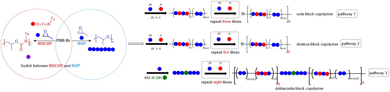 本研究中,王晓武教授和李志波教授团队使用组内之前报道的单组分鏻盐硼路易斯酸碱对(PBB-Br)作为催化剂,通过一锅法顺序添加单体混合物,使得两种单体的聚合反应在ROCOP和ROP之间多次切换,合成了一系列序列结构明确的嵌段共聚物,高达33个嵌段(图1)。