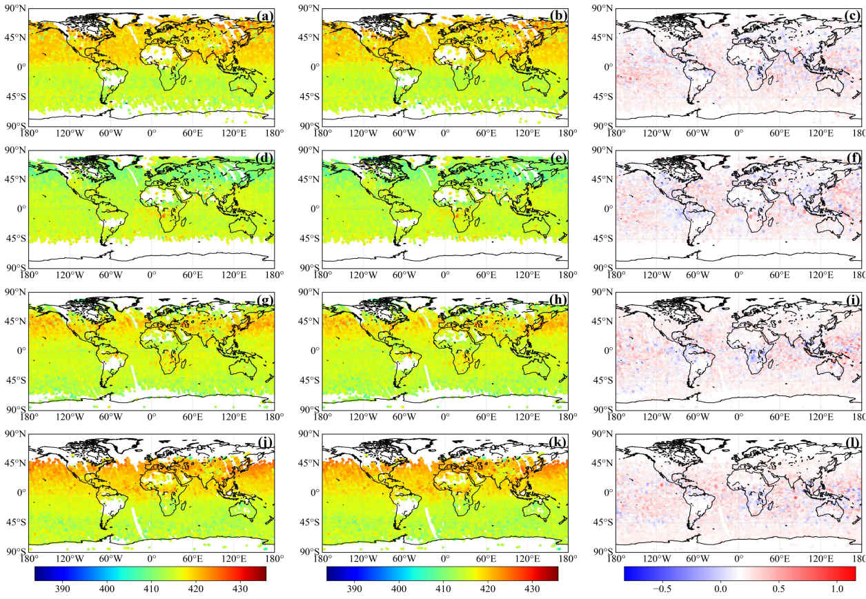 另一研究聚焦于全球首颗主动激光雷达二氧化碳监测卫星——大气一号(DQ-1,2022年4月16日发射),重点探讨了在利用氧气A波段反演大气CO₂柱浓度(XCO₂)时是否必须同步获取氧浓度数据这一关键问题。传统上,卫星光谱仪通常借助O₂-A带获取氧气浓度,并利用氧气与干空气的稳定比例关系对CO₂进行归一化处理,以有效减少系统误差和仪器偏差,提高反演精度。该研究提出了一种基于气象数据的替代归一化方法,可在保证精度的同时降低对硬件的要求和成本。团队利用轨道碳观测卫星2号(OCO-2)的实测数据,对比了O₂-A带归一化与气象数据归一化所得CO₂反演结果,并借助总碳柱观测网络(TCCON)数据进行了验证,为卫星反演算法的优化提供了新路径。文章链接:DOI:10.1109/TGRS.2025.3575603