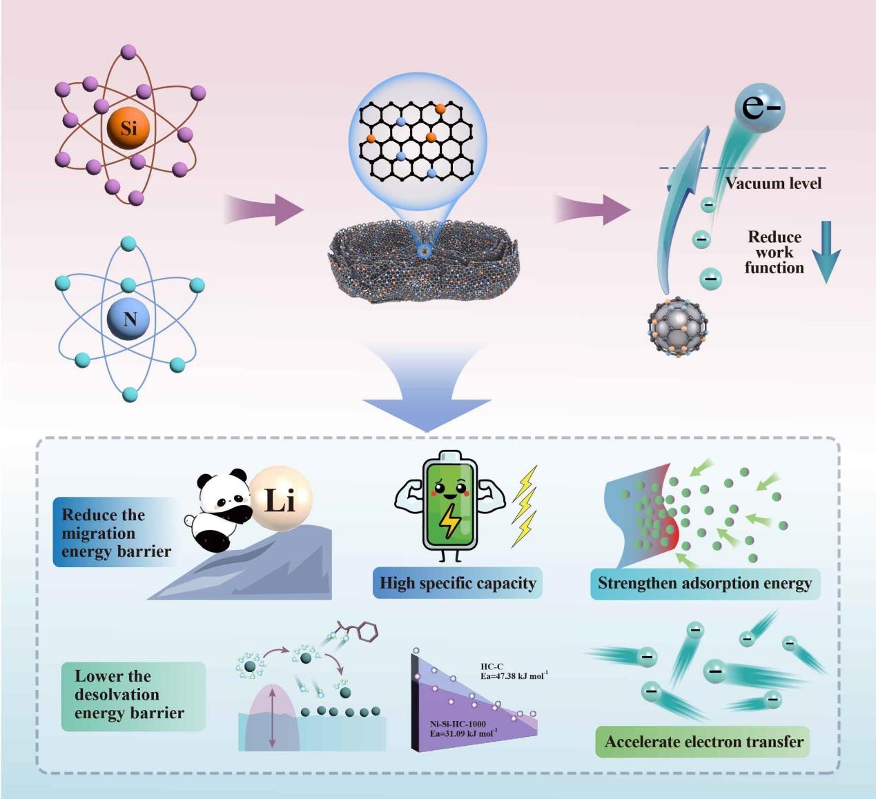 近日,永利3044浏览器朱晓东/木天胜团队在《Advanced Functional Materials》期刊上发表了题为“Tailored Work Function by N, Si Co-Doping Enables High-Performance Hard Carbon Anode for Lithium-lon Batteries”的研究论文(中科院一区,影响因子:19)。化工学院研究生宋佳瑶为论文第一作者,朱晓东教授、木天胜副教授为论文共同通讯作者。