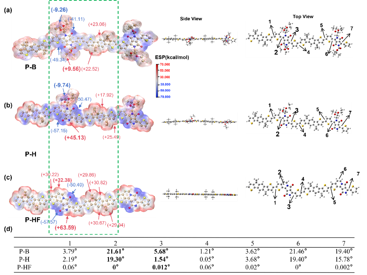 通过对三种聚合物的两个重复单元的度泛函理论计算(图3),可以发现与P-B相比,其他两种聚合物具有显著提升的平面性,而经过R-F处理后的重复单元表现出几乎完全共平面的主链结构。此外,这三种材料的静电势计算显示,由于引入了亚乙烯基的正电位, P-HF的正负电荷边界清晰。在三种聚合物中,由于直接的D-A效应以及融合DPP单元内的平面结构,P-HF的推拉效应最强,表现出显著增大的DPP和IDT之间的电负性范围,有利于增强分子间的静电相互作用。这些计算证实了协同作用有助于形成具有高平面主链的共轭聚合物,增强分子间的作用力并强化ICT效应