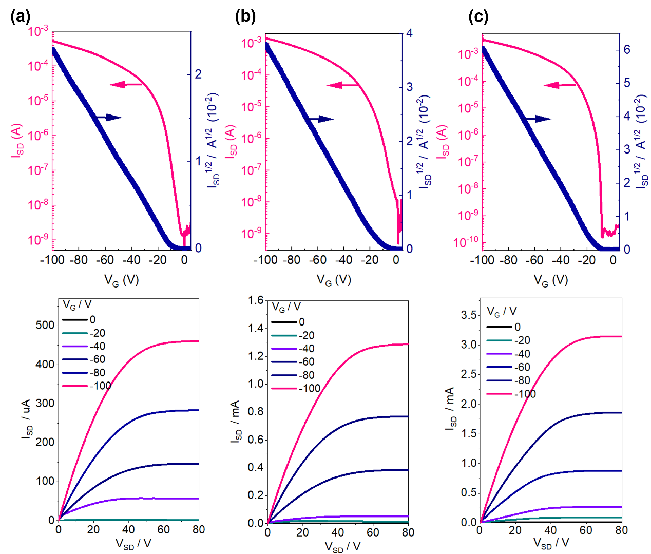 为了研究H-B和R-F对聚合物半导体层中电荷载流子转移率的影响,我们制备了基于三种聚合物的底栅底部接触(BGBC)结构OFET器件。如图5所示,三种聚合物都具有空穴传输特性。协同作用下的P-HF的μh达到了5.02 cm2V-1s-1,是目前报道的最高值之一。μh的提升可归因于以下因素:(i)优化的聚合物骨架平面度和共轭体系。(ii)分子间H-B的形成,促进P-H和P-HF聚合物链发生自组装,形成更紧密的局部有序堆积行为、氢键引起的局部载流子转移以及更强的分子间相互作用,最终实现更高效的分子间电荷传输。(ⅲ) R-F使聚合物P-HF的骨架具有更长的π共轭延伸和较强的D-A效应,有利于电荷的内部传输。(iv) P-HF较高的HOMO能级,增强了聚合物与电极之间的欧姆接触特性,有利于空穴注入。